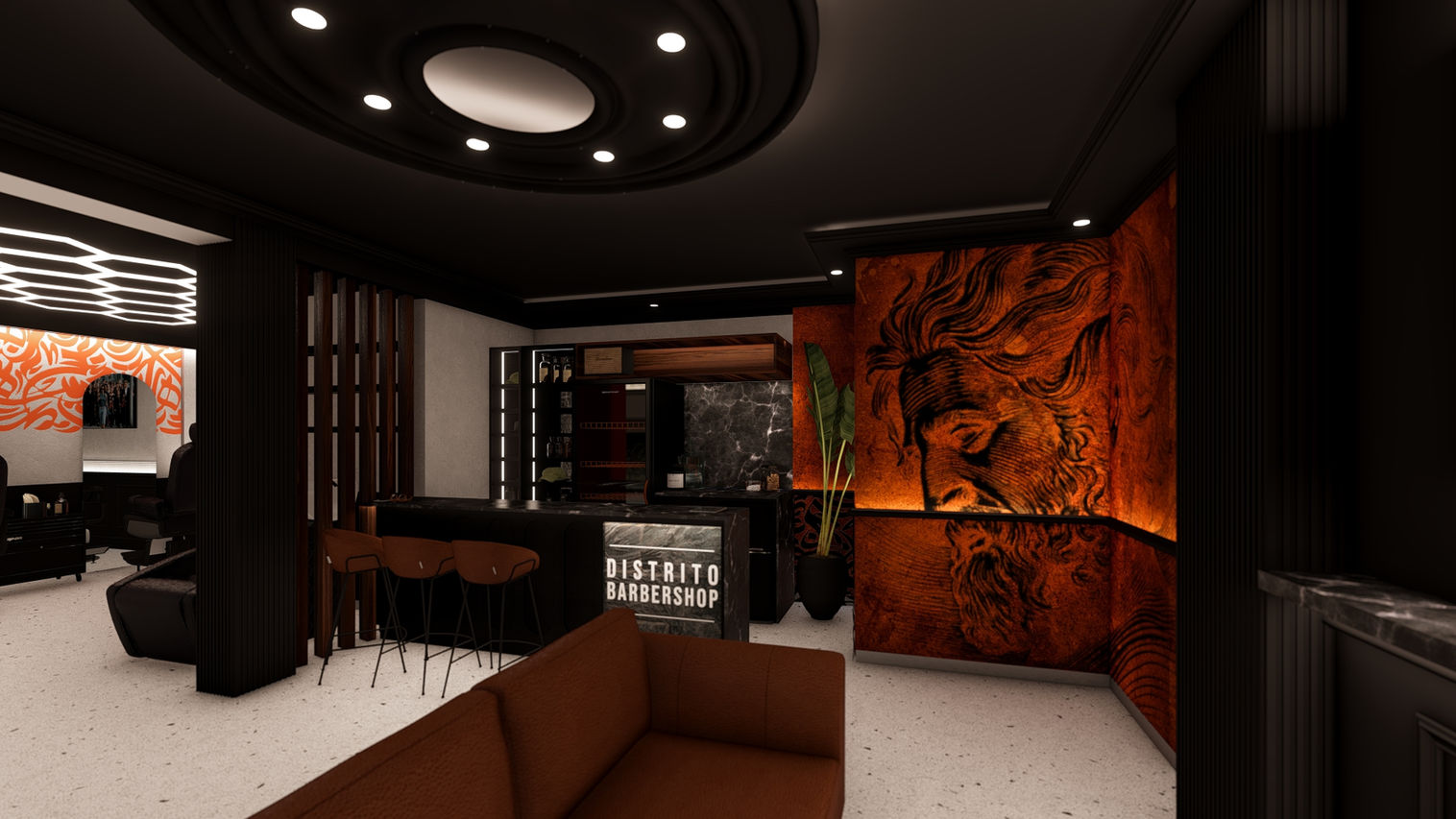 La distribución interior prioriza la funcionalidad sin sacrificar el carácter escenográfico: el mostrador central con iluminación integrada, las repisas de productos y el área de espera se organizan en una composición equilibrada que potencia la experiencia del usuario. Cada elemento, desde el arte mural hasta el diseño del techo, responde a una narrativa espacial coherente, donde el branding y la arquitectura se entrelazan para proyectar una barbería con personalidad, memoria visual y vocación de marca.